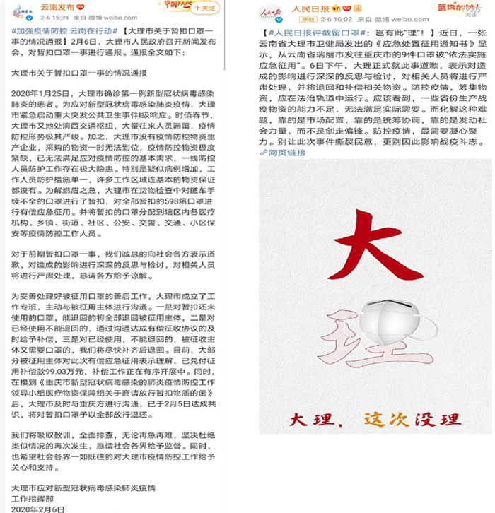 2020年2月5日,云南省大理市卫健委“征用”其他省市口罩一事甚嚣尘上,事件始末官媒已详细介绍,笔者不再赘述(见下图)。